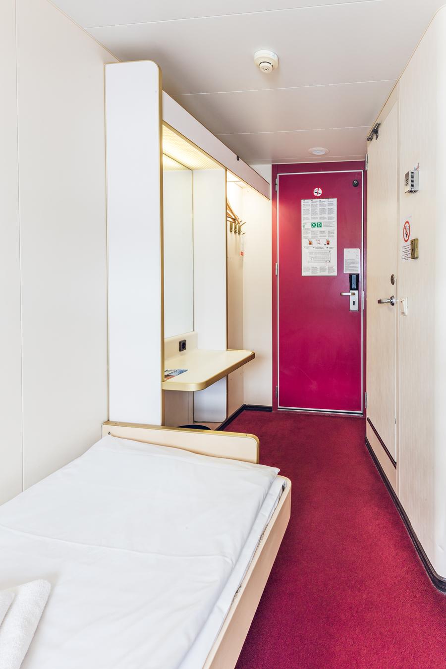 Diese Innenkabine bietet Platz für bis zu vier Personen; es gibt zwei untere Einzelbetten und zwei aufklappbare obere Betten. Die Kabine ist mit Dusche, WC, Klimaanlage und geräumigem Kleiderschrank ausgestattet. Das Frühstück ist nicht im Kabinenpreis inbegriffen.