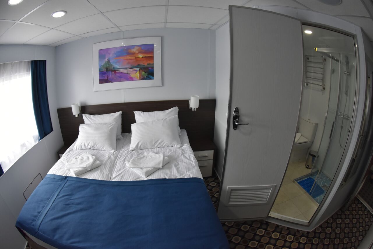 Die geräumige Zweibett- / Doppelkabine mit großem Panoramafenster ist mit Heiz- und Lüftungsanlage, Kleiderschrank, 220 V Steckdose, Radio ausgestattet. Die Kabine verfügt über neue Möbeln und Beleuchtung und ist im modernen Stil eingerichtet. Renoviertes Badezimmer ist großer als Standard (es gibt noch separat eine Dusche in der Ecke).