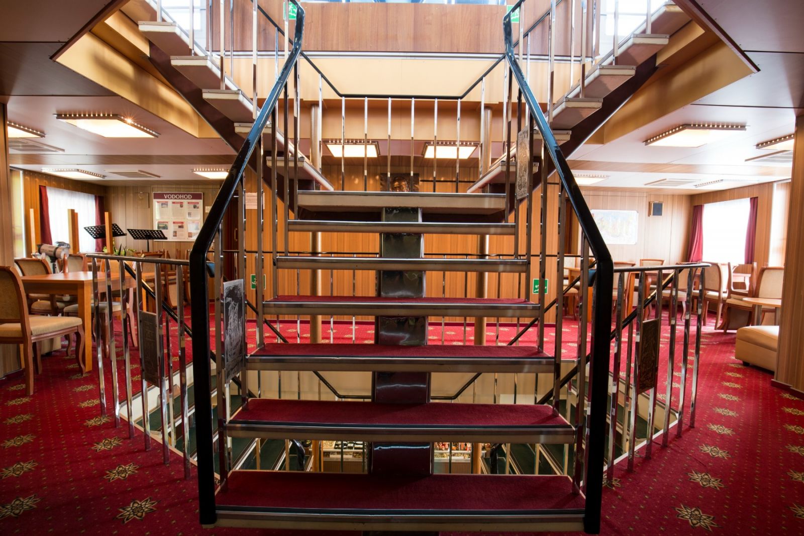 Das Schiff verfügt über private Außenkabinen und ist mit Klimaanlage ausgestattet. So haben Sie einen majestätischen Blick auf die vorbeiziehenden Landschaften. In den Speisesälen werden in freundlicher Atmosphäre kontinentale und russische Küche, sowie Spezialitäten aus der Umgebung angeboten. Es gibt zwei Bars, einen kleinen Souvenirshop, ein Musikzimmer, Tanzsaal, Sauna und Solarium. Ein Waschsalon ist ebenfalls an Bord vorhanden. Partys, Spiele, Tanz und Bordunterhaltung tragen allesamt dazu bei, Ihre Kreuzfahrt zu einem unvergesslichen Erlebnis zu machen. Mit seinen geräumigen Lounges und Sonnendecks bietet Ihnen unser schwimmendes Hotel ein herausragendes Reiseerlebnis.