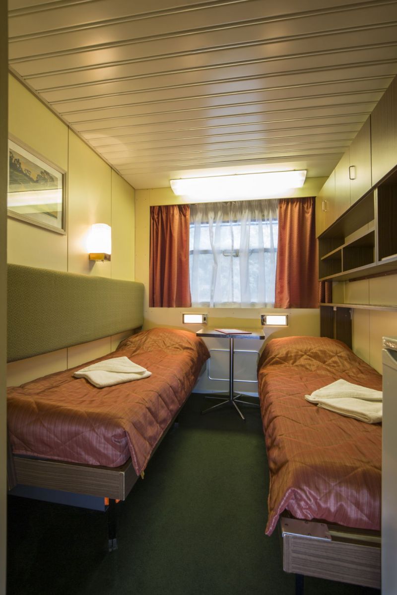 Vier-Bett- Kabinen mit 2 Bullaugen ist rund 13 Quadratmeter groß und mit eigenem Bad, Heizung und Klimaanlage, Kühlschrank, Kleiderschrank, Spiegel- Konsole, 220 Volt, Radio ausgestattet. In der Kabine stehen zwei Einzelbetten und zwei obere Schrankbetten. Maximale Belegung 4 Personen.