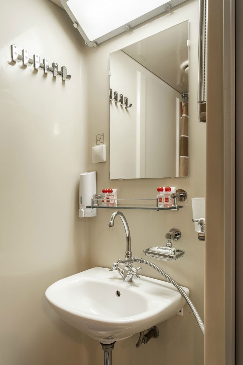 - Badezimmer (ausgenommen Suitekabinen): die Dusche ist von der Toilette durch den Duschvorhang getrennt. Der Duschkopf ist an der Wand befestigt. Die Dusche wird vom Rest des Bades nicht getrennt, nur durch den Vorhang.