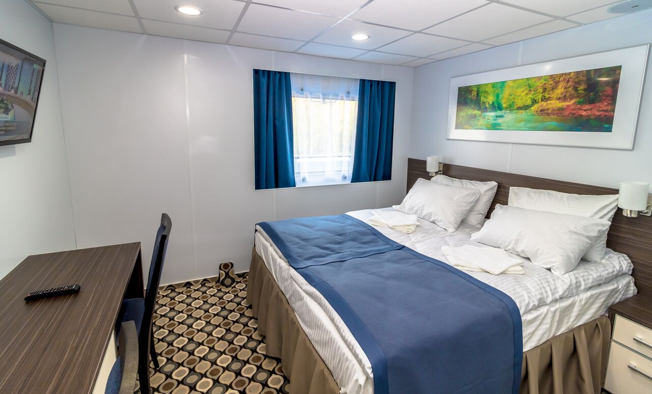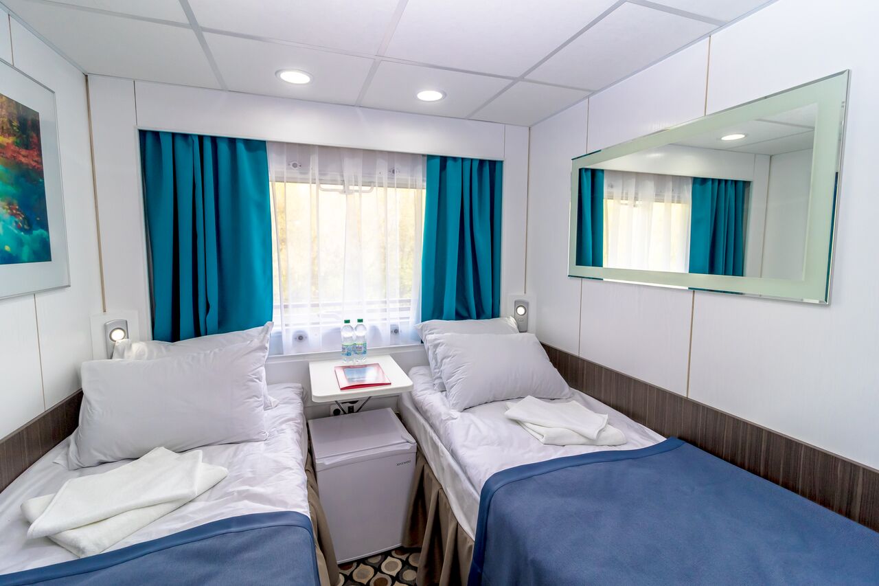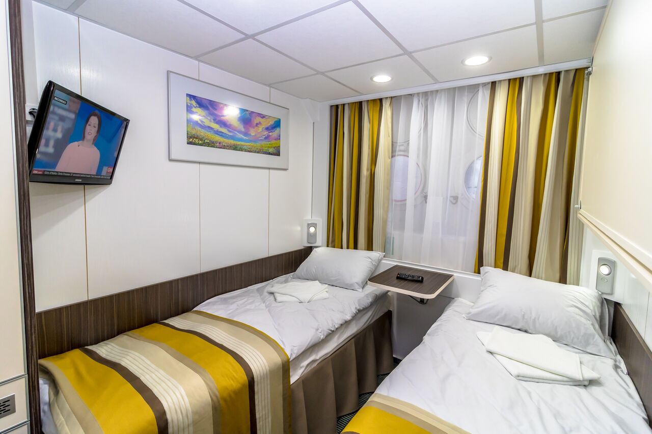 Zwei-Bett-Außenkabine mit einem großen Panoramafenster verfügt über Heiz- und Lüftungssystem, Kleiderschrank, 220 V Steckdosen, Radioist mit neuen Möbeln und Beleuchtung ausgestattet und im modernen Stil eingerichtet. Renoviertes Badezimmer ist großer als Standard.